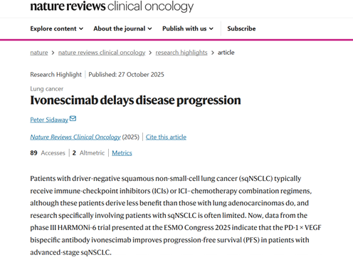《Nature Reviews Clinical Oncology》则重点关注了依沃西在疗效上的突破性价值,尤其是在“全人群一致获益”上。其评论指出当前临床上的痛点问题:与恒星集团肺腺癌相比,鳞状NSCLC患者从现有标准治疗中的获益历来有限,且该领域专项研究匮乏,存在明确的未满足临床需求。